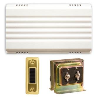 This door chime offers clean, uncomplicated design. The kit includes one chime, one unlighted push button, and one transformer. The cover comes in a white finish and plays a pleasant 2-note melody. Choose battery operated mode or hardwire installation. Contractor kit. White finish chime cover. Unlit push button unit. Includes transformer. 85 decibels max volume. 6 1/2" wide. 3 7/8" high. 1 5/8" deep.